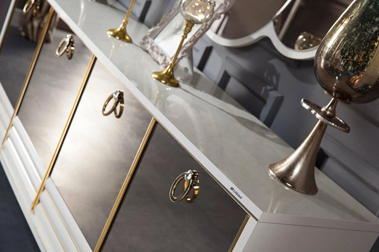 L’ensemble Elite vous proposes chic buffet avec miroir possédant 4 portes avec étagères ainsi qu’un compartiment à couvert. Conçu dans le respect des normes E1, cet ensemble résiste aux rayures, frotemments, et s’entretient très facilement. Pour votre sécurité, les portes et tiroirs sont muni d’amortisseur ralentissant les fermetures brusques.