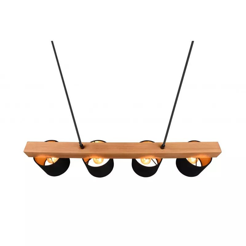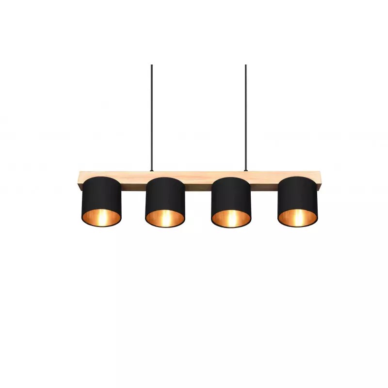 La suspension Cameron est un luminaire Trio au design simple mais très élégant. Ce luminaire se fixe au plafond et s’ajuste en hauteur. Deux fils viennent maintenir une tige horizontale en bois naturel sur laquelle nous trouvons quatre abats-jours.